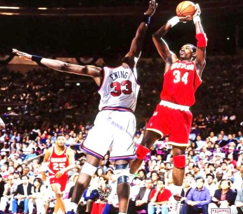 除了無(wú)解的腳步,奧拉朱旺還擁有穩(wěn)定的中距離投籃能力。在那個(gè)內(nèi)線對(duì)抗堪稱“絞肉機(jī)”的年代,他既能用夢(mèng)幻腳步在籃下輾轉(zhuǎn)騰挪,完成高難度上籃或扣籃,也能在罰球線附近接球后,用一記干脆利落的中投終結(jié)進(jìn)攻。他的單打,不僅是力量與身高的碾壓,更是技巧與智慧的完美結(jié)合,重新定義了中鋒單打“不只是靠身體”的可能性。