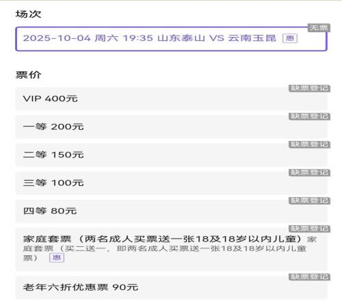 購票平臺上,泰山VS云南玉昆所有球票都顯示“缺貨登記”狀態(tài)。