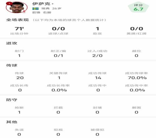 伊薩克數(shù)據(jù):上場71分鐘送出1次助攻,1次射門未能進(jìn)球