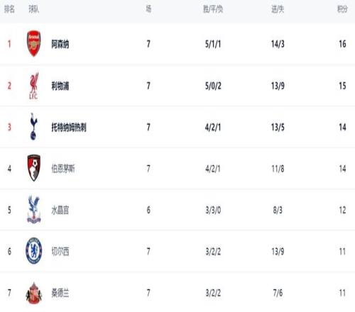 在積分榜上,贏球的阿森納登上了榜首位置。阿森納5勝1平1負(fù),拿到了16分。利物浦這輪落敗,依然是15分,排名第2。熱刺以14分排名第3。伯恩茅斯這匹黑馬也是14分,排名第4。水晶宮以12分排名第5。切爾西和桑德蘭都是11分。曼城和曼聯(lián)則都是10分。