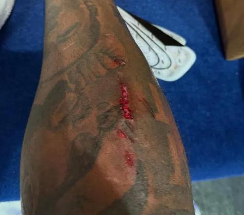 切爾西隊長里斯-詹姆斯在社交媒體上展示了在剛剛對陣?yán)锲忠灰酆笏彝鹊臓顩r,圖中看出他的小腿被鞋釘刮出了一道血口子。