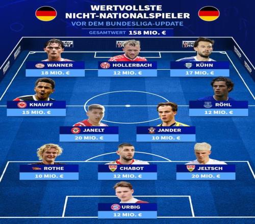北京時間10月11日,德轉統計出了從未入選過德國成年國家隊的現役最貴德國11人陣容,布倫特福德中場雅內爾特以及斯圖加特后衛(wèi)耶爾奇以2000萬歐元的身價領銜,拜仁慕尼黑的門將烏爾比希以及今夏轉會埃因霍溫的保羅-萬納在列。