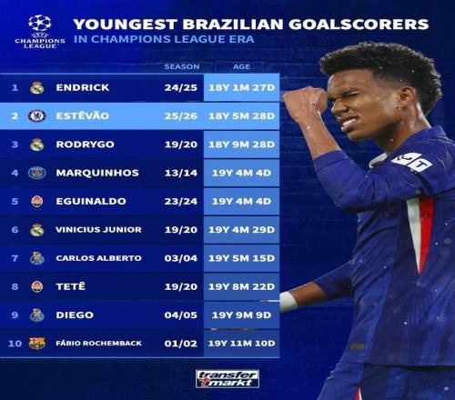 在與阿賈克斯的比賽中斬獲歐冠生涯處子球后,18歲的埃斯特旺成為切爾西隊(duì)史歐冠最年輕進(jìn)球者,他也是歐冠進(jìn)球第二年輕的巴西球員,僅次于恩德里克。