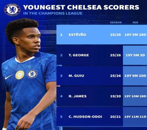 北京時(shí)間10月23日,切爾西在歐冠聯(lián)賽階段第3輪的比賽中主場(chǎng)5-1大勝10人作戰(zhàn)的阿賈克斯,其中18歲的埃斯特旺、19歲的泰里克-喬治以及19歲的吉烏均有進(jìn)球入賬,賽后在德轉(zhuǎn)統(tǒng)計(jì)出的切爾西隊(duì)史歐冠最年輕進(jìn)球榜上,這三名球員位列前三。
