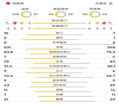 射門數(shù)據(jù)方面,阿森納全場(chǎng)10次射門3次射正攻入1球,水晶宮則是全場(chǎng)7次射門1次射正。