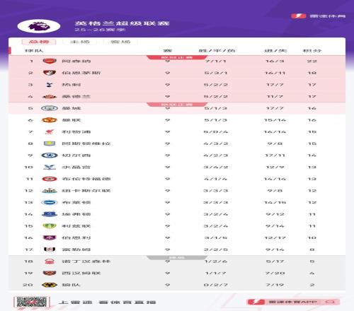 雷速體育10月27日?qǐng)?bào)道宣稱 英超第九輪比賽已經(jīng)全部結(jié)束,積分榜方面,阿森納22分繼續(xù)領(lǐng)跑,伯恩茅斯第二,熱刺、桑德蘭分列三四位。