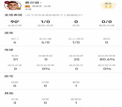 比賽中費爾明31次傳球,25次到位,傳球成功率80.6%。