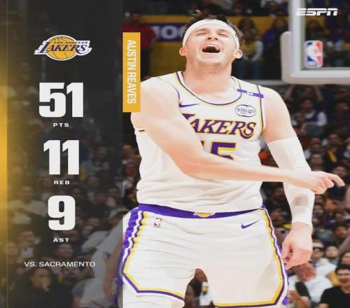 單核帶隊(duì)的里夫斯,投籃22中12,其中三分10中6,罰球22中21狂轟51分11板9助炸裂數(shù)據(jù),正負(fù)值+22,湖人127-120擊敗國(guó)王。
