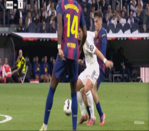 第28分鐘,皇馬前場右側(cè)60度角任意球快發(fā),姆巴佩插上拿球突入禁區(qū)小角度怒射,門將什琴斯尼奮力將球撲出。第37分鐘,巴薩前場左側(cè)高位逼搶,巴爾韋德將球傳回中路,居萊爾停球停大了,佩德里上搶將球斷走,巴薩這邊就地反擊,連續(xù)的配合,拉什福德禁區(qū)左側(cè)策應(yīng)橫傳中路,后排跟進(jìn)的費爾明小禁區(qū)前沿迎球大力推射,皮球應(yīng)聲入網(wǎng),巴薩1:1扳平比分。僅僅4分鐘后皇馬這邊快速回應(yīng),維尼修斯左路硬超孔德下底傳中,米利唐后點高高躍起頭球擺渡頂?shù)介T前,巴薩這邊防守漏人,無人防守的貝林厄姆門線前凌空將球掃入半空門,皇馬2:1快速的再次取得領(lǐng)先。