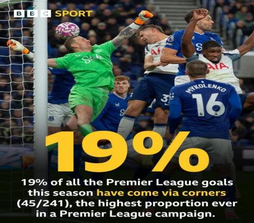 數(shù)據(jù)統(tǒng)計(jì)顯示,本賽季英超共進(jìn)241球、其中45球來(lái)自角球進(jìn)攻,19%的比率也是英超單賽季最高的。