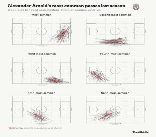 下圖突顯了阿諾德上賽季最頻繁的長(zhǎng)傳(超過(guò)15碼),展示了那些快速傳中對(duì)禁區(qū)內(nèi)的威脅。