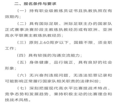 第三,原則上60周歲以下,國籍不限,須全職工作;第四,具有較強的溝通交流能力;第五,身體健康,品行端正,具有良好的社會形象;第六,無興奮劑違規(guī)問題,無違法犯罪記錄和可能影響正常履行國家隊相關職責的法律糾紛;