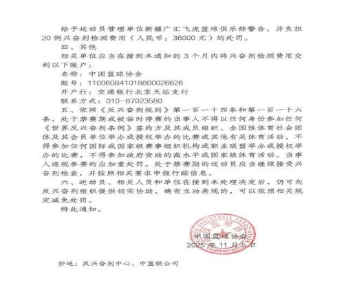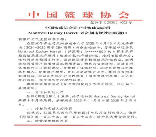 北京時(shí)間今日,中國(guó)籃協(xié)官方發(fā)布公告,上賽季效力于新疆男籃的外援蒙特雷茲-哈雷爾因興奮劑違規(guī)被禁賽3個(gè)月,期限為2025年11月5日到2026年2月4日,新疆男籃則承擔(dān)20例興奮劑檢測(cè)的費(fèi)用共36000元。