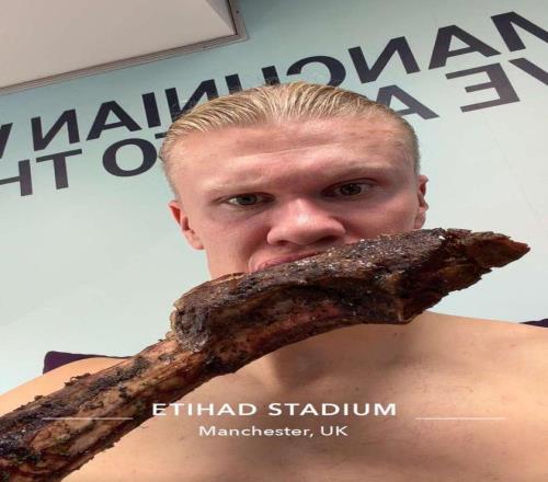 比賽結束后,哈蘭德在社交媒體上曬出了自己在更衣室吃羊排的照片。