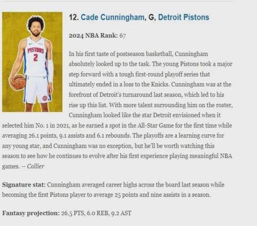 在賽季開賽前美國ESPN評選的NBA百大球星中,坎寧安位列第12位,而在2024-25賽季開賽時他的排位是67位,經(jīng)過一個賽季打拼,他取得飛速進(jìn)步,網(wǎng)站評語如下:坎寧安首次體驗季后賽,就展現(xiàn)出了不俗實力,年輕的活塞隊在季后賽首輪與尼克斯隊展開了激烈較量,最終惜敗,但他們?nèi)匀蝗〉昧碎L足進(jìn)步.坎寧安是底特律復(fù)興的關(guān)鍵人物,這也讓他在這份榜單上名列前茅。隨著球隊陣容中更多優(yōu)秀球員加入,坎寧安展現(xiàn)出了底特律在2021年選秀大會上用狀元簽選中他時所期待的明星風(fēng)采.他首次入選全明星賽,場均貢獻(xiàn)26.1分、9.1次助攻、6.1個籃板。季后賽對于任何一位年輕球星來說都是一次寶貴的學(xué)習(xí)機會,坎寧安也不例外.本賽季,他的表現(xiàn)值得關(guān)注,我們將拭目以待,看看他在首次征戰(zhàn)NBA季后賽后將如何成長.