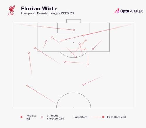 考慮各項賽事,維爾茨已經(jīng)為利物浦出場16次,未斬獲進球,有3次助攻入賬。