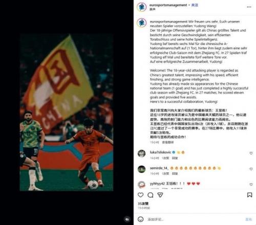 該公司發(fā)文宣布,“我們非常高興向大家介紹我們的最新球員:王鈺棟!這位18歲的進(jìn)攻球員被認(rèn)為是中國最具天賦的球員之一,他以速度快、高效的射門能力和出色的比賽閱讀能力而聞名。王鈺棟已經(jīng)代表中國國家隊出場6次(并攻入1球),并且剛剛在浙江隊度過了一個非常成功的賽季。在27場比賽中,他攻入11球并貢獻(xiàn)5次助攻。期待與鈺棟的成功合作!”