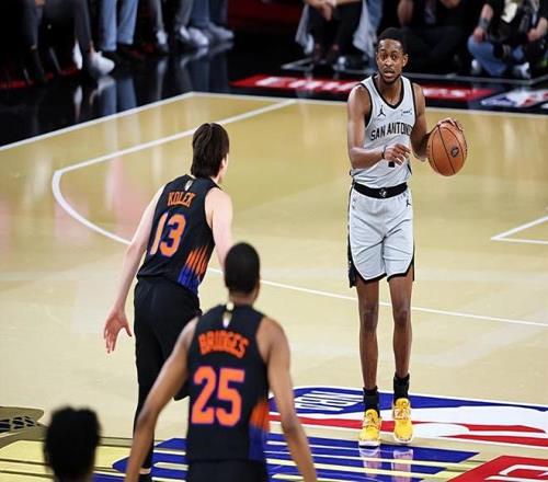 本場比賽中,馬刺的先發(fā)控衛(wèi)達(dá)隆-??怂梗―e'Aaron Fox)顯然并沒有發(fā)揮出自己的實力。福克斯全場出場31分40秒,投籃13中5,三分線外6中2,罰球6中4,得到了16分2籃板9助攻1搶斷的數(shù)據(jù),還有5次失誤和3次犯規(guī),正負(fù)值為-4。??怂乖诒緢霰荣愔型耆珱]有展現(xiàn)出自己的得分能力,他的進(jìn)攻效率并不理想,他的突破成功率非常有限,外線投籃方面的表現(xiàn)也并不是特別理想。??怂拐宫F(xiàn)出了一定的傳球能力和組織能力,然而他在失誤控制方面也存在著不小的問題。不僅如此,??怂乖诜朗囟说谋憩F(xiàn)也是比較一般的,貢獻(xiàn)度同樣是非常有限的。??怂贡緫?yīng)該是球隊的后場核心,然而至少在本場比賽中,他并沒有很好地扮演自己的角色,并沒有將自己在進(jìn)攻端的全能性發(fā)揮出來,這也在一定程度上導(dǎo)致了球隊的這場失利。