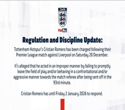 熱刺球員克里斯蒂安-羅梅羅在12月20日與利物浦的英超比賽后被指控,據(jù)稱,他在第93分鐘被罰下場(chǎng)后,沒有及時(shí)離開比賽場(chǎng)地和/或以對(duì)抗性和/或攻擊性的方式對(duì)待比賽裁判。克里斯蒂安-羅梅羅需要在2026年1月2日之前作出回應(yīng)。