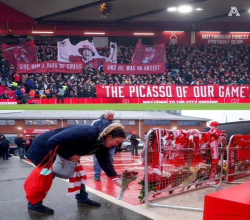 本輪賽前,諾丁漢森林隊主場周邊已為紀念羅伯遜設(shè)立了獻花區(qū)與緬懷角,不少球迷獻上鮮花悼念。比賽開始前,球迷也打出Tifo致敬這位隨森林隊兩奪歐冠的球隊傳奇。
