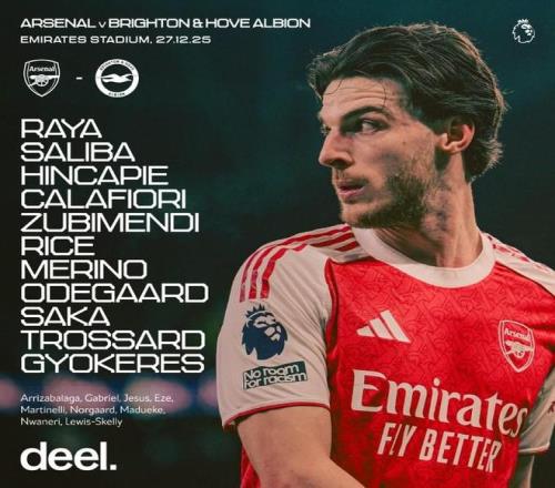 北京時(shí)間12月27日23:00,英超第18輪,阿森納主場(chǎng)對(duì)陣布萊頓。賽前首發(fā)公布。