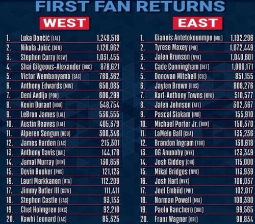 全明星首輪投票結(jié)果:詹姆斯僅排名西部第九,東契奇西部第一!