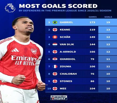 北京時間12月31日,德轉(zhuǎn)統(tǒng)計了自2020-21賽季以來英超后衛(wèi)進球榜,加布里埃爾以19球高居第一,范戴克、亞歷山大-阿諾德、格瓦迪奧爾、查洛巴以及斯通斯上榜。
